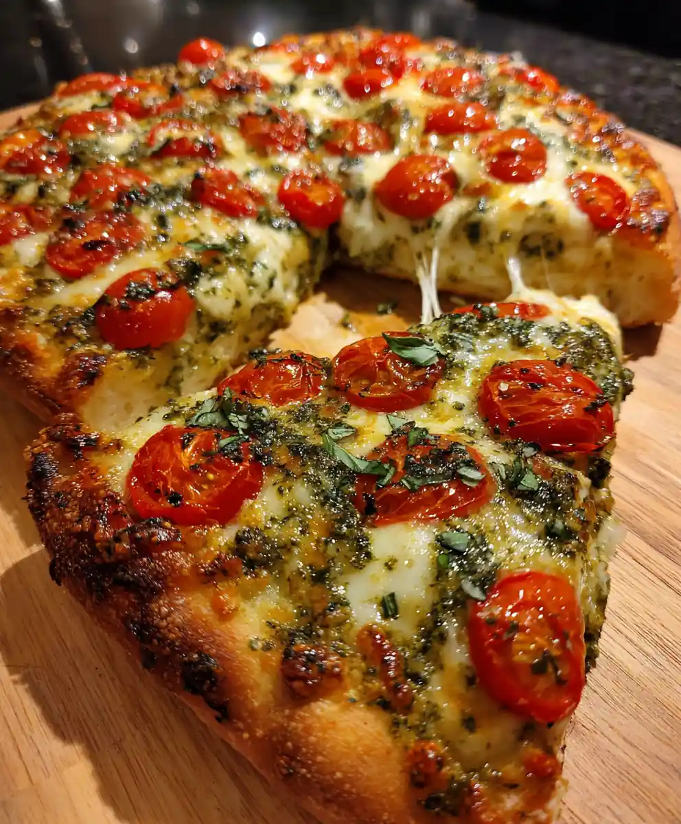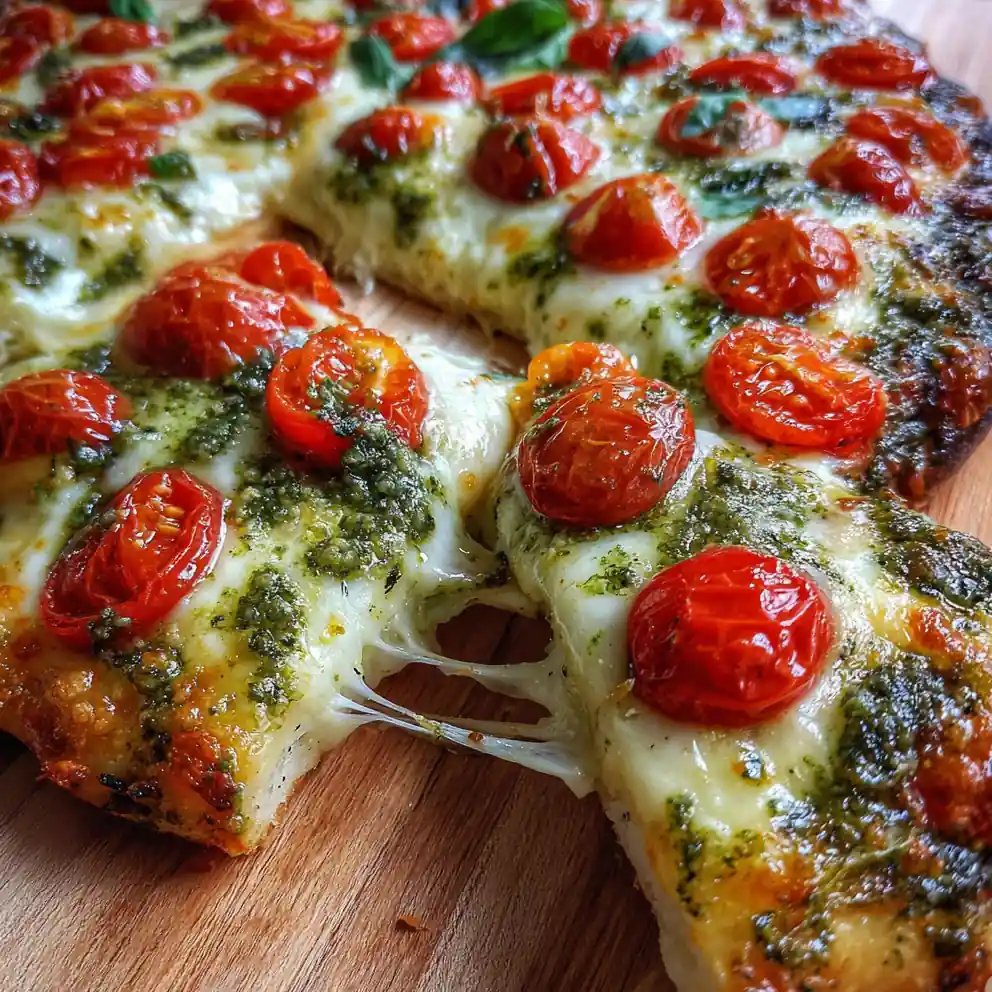 This pesto pizza recipe features a vibrant basil pesto base topped with sweet roasted cherry tomatoes and melted mozzarella on a crisp crust, offering a fresh, easy, and healthy dinner idea.