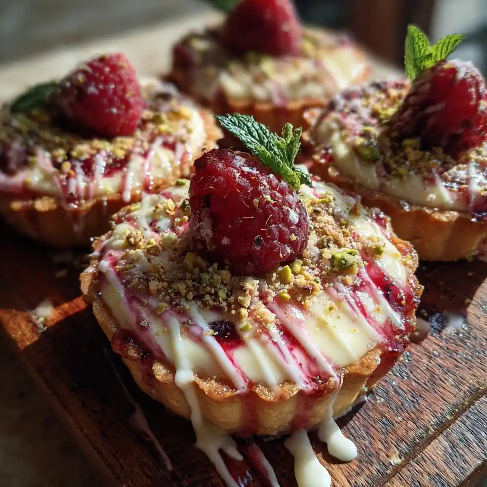 These Raspberry White Chocolate Tartlets are a delightful treat featuring a buttery crust, cardamom-spiced white chocolate ganache, raspberry swirl, and pistachio crumble. They’re perfect for special occasions or a moment of indulgence.