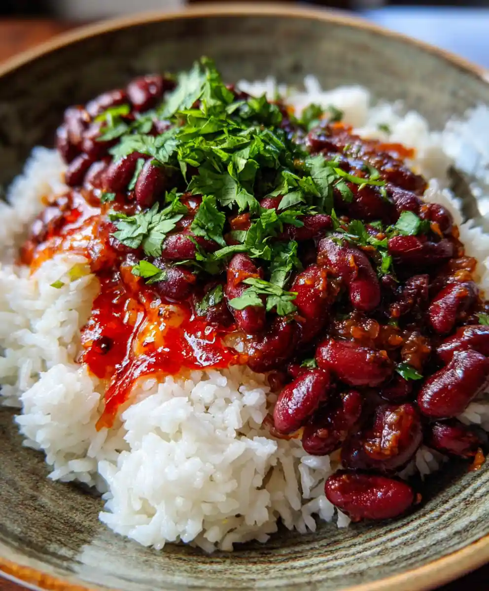 - Plate and Garnish: To serve, scoop a generous portion of fluffy white rice into a bowl. Ladle the rich red beans next to or over the rice. Drizzle a generous amount of the vibrant Smoky Chipotle and Roasted Red Pepper Swirl over everything and garnish with fresh cilantro.