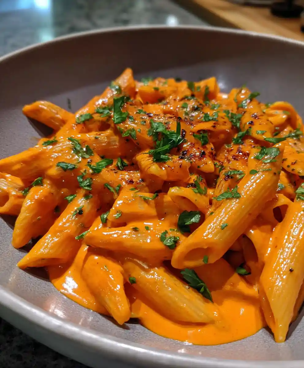 Garnish generously with the freshly chopped parsley, allowing its vibrant green to contrast with the pasta’s rich, orange-red hue.