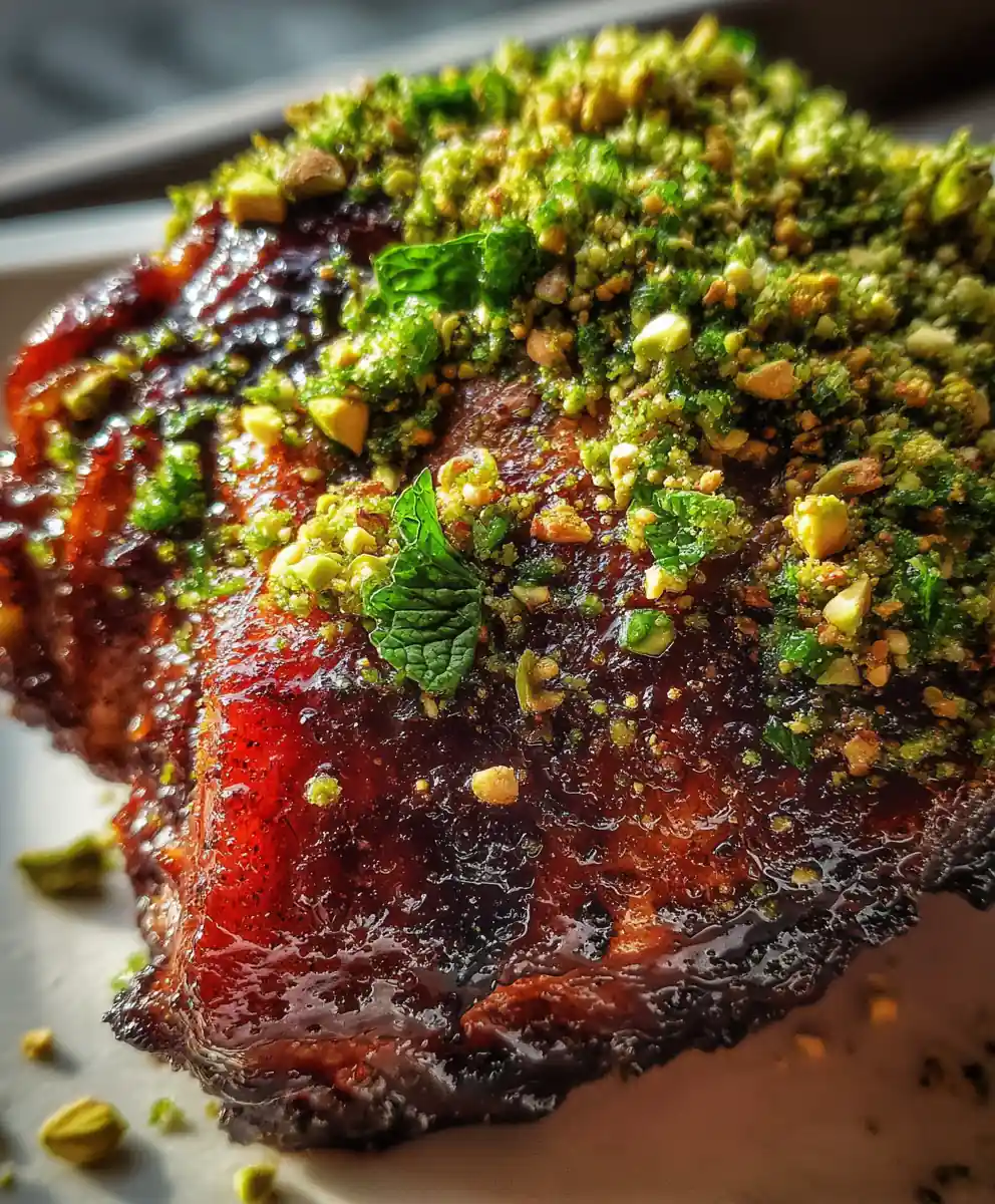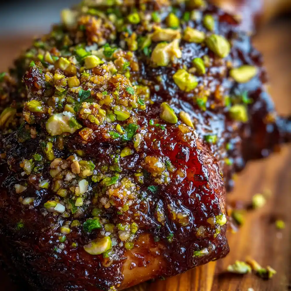 - Once roasted, remove the turkey legs from the oven and transfer them to a cutting board. Tent loosely with foil and let rest for 10-15 minutes. This allows the juices to redistribute, ensuring moist meat. Serve with any remaining glaze artfully drizzled and a generous sprinkling of the vibrant Pistachio-Mint Crumble.