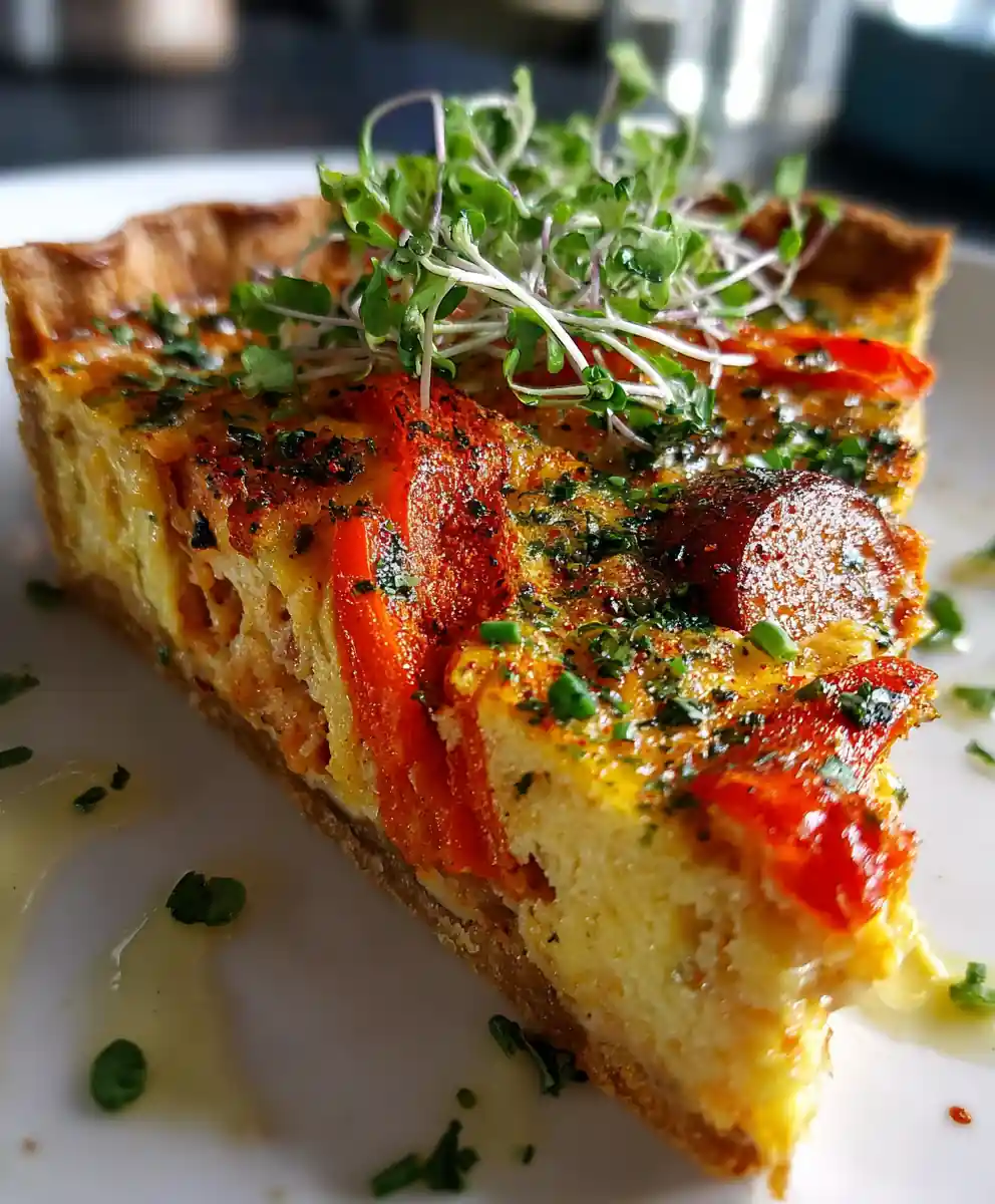 - Rest and Garnish: Once baked, remove the quiche from the oven and let it rest on a wire rack for at least 10 minutes before slicing. This allows the custard to set completely. Garnish with thin strips of roasted red pepper, a scattering of microgreen sprouts, and a delicate drizzle of herb-infused olive oil. A light dusting of smoked paprika adds a final touch of color and flavor.