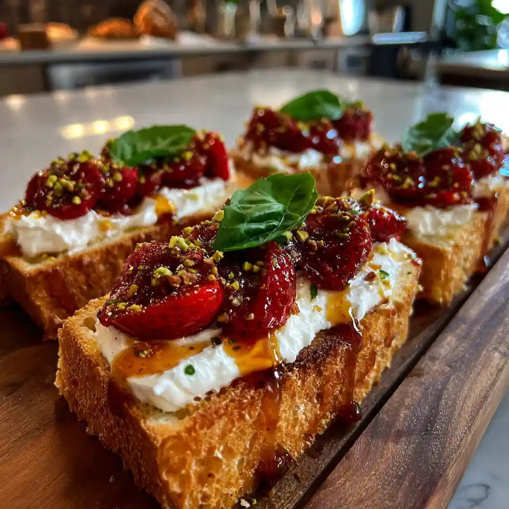 - Garnish and Serve: Finish each piece of toast with a sprinkle of coarsely chopped pistachios and a few fresh basil leaves for added color, texture, and fragrance. Plate the toasts attractively, perhaps slightly overlapping, on a rustic wooden board or a clean white plate. Drizzle any leftover basil honey glaze in a thin line across the plate and dust lightly with extra pistachio crumbs for a visually appealing presentation.