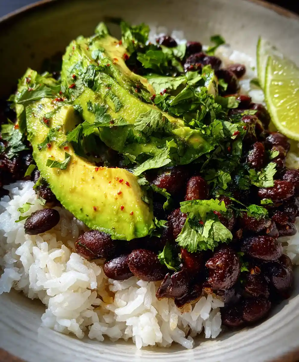 - Assemble and Garnish: To serve, spoon a generous bed of fluffy rice into a bowl. Create a well in the center of the rice and ladle the seasoned black beans into the well. Drizzle a thin line of olive oil around the rim of the bowl. Scatter chopped cilantro evenly over the top. Arrange lime wedges and avocado slices (if using) on the side. Finish with a light dusting of extra cilantro for a pop of color.
