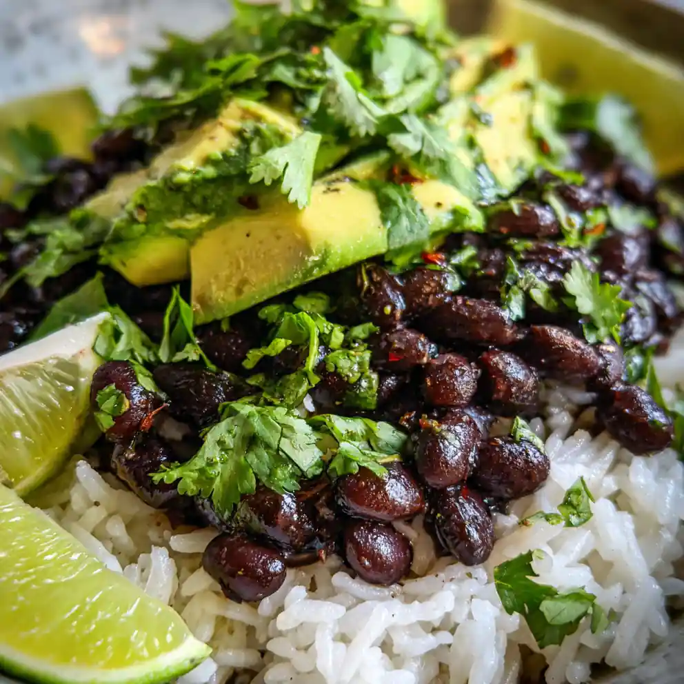 - Assemble & Garnish: Serve beans over rice, garnish with cilantro and lime.