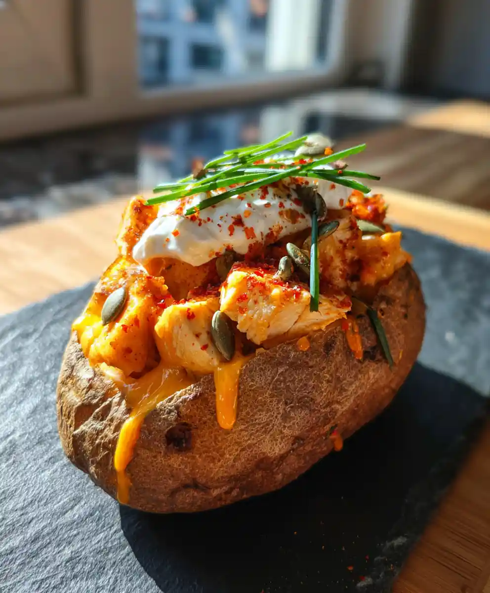 - Assemble Potatoes: Slice potatoes, fluff the interior, and fill with chicken.