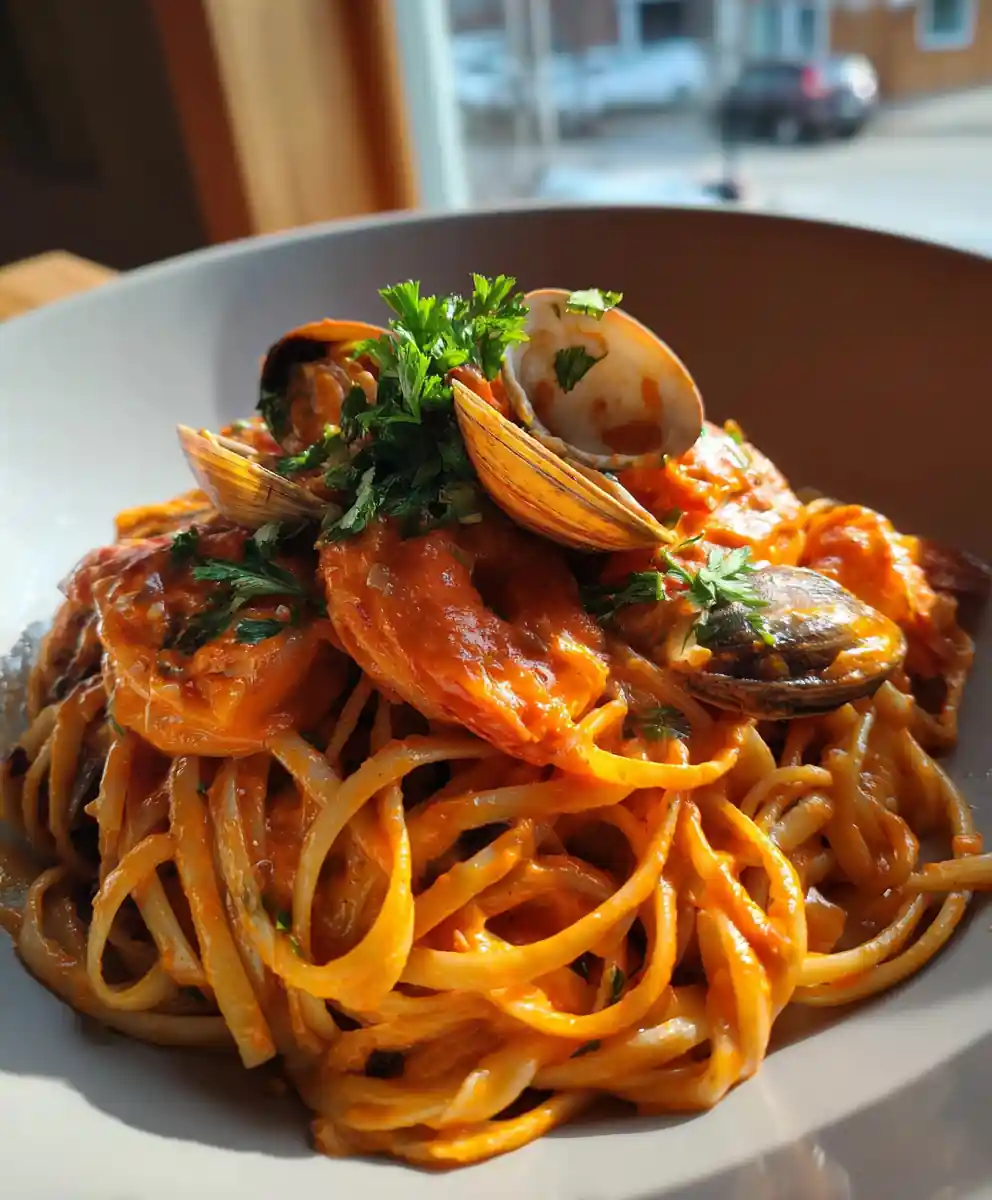 This dish features a vibrant, creamy sauce that clings to every strand of pasta, creating a truly luxurious dining experience. Itโs an easy dinner idea that uses a rich roasted red pepper and harissa cream base instead of a traditional white wine sauce. This creamy seafood linguine recipe is perfect for a weeknight and impressive enough for guests.