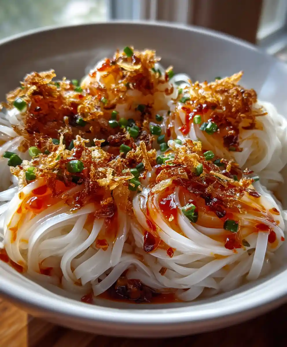 - Combine and Serve: Transfer the drained rice noodles to a wide serving bowl; pour the base sauce over them. Add a generous drizzle of the cooled Smoky Chili-Garlic Drizzle (including some of the infused garlic and chili flakes). Toss gently with tongs to ensure all noodles are evenly coated and gleaming with the oil and sauce, then garnish generously with the crispy shallots and fresh herbs and serve immediately.