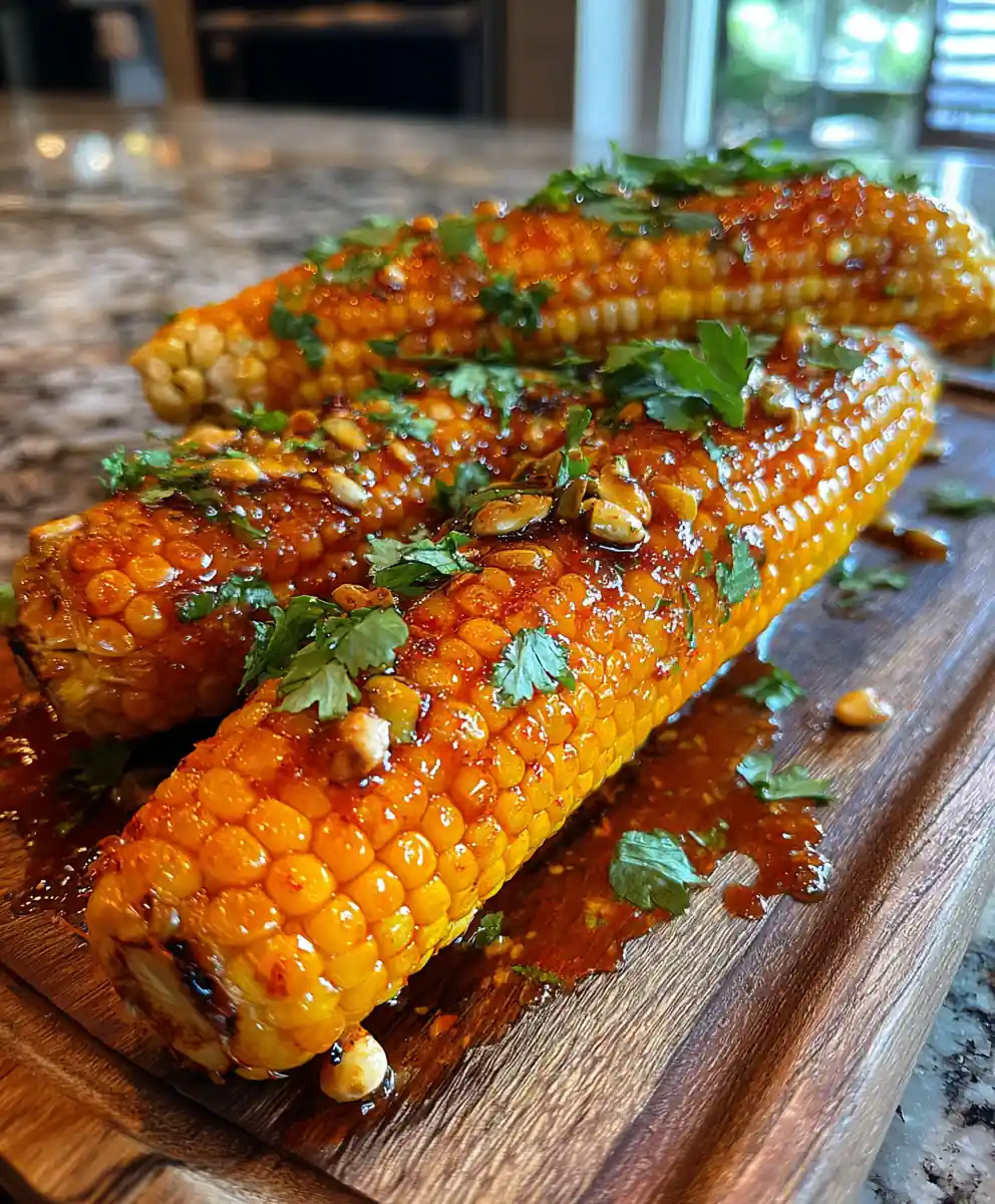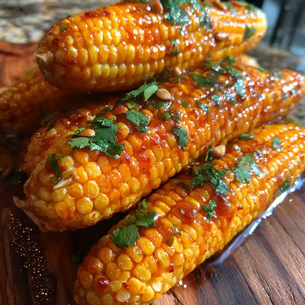 - Serve and Garnish: Remove the corn from the skillet and transfer it to a serving platter. Drizzle any remaining glaze from the pan over the ears for extra shine and flavor. Finish with a sprinkling of toasted pepitas (pumpkin seeds) and chopped fresh cilantro for added texture, color, and a fresh herbal note.