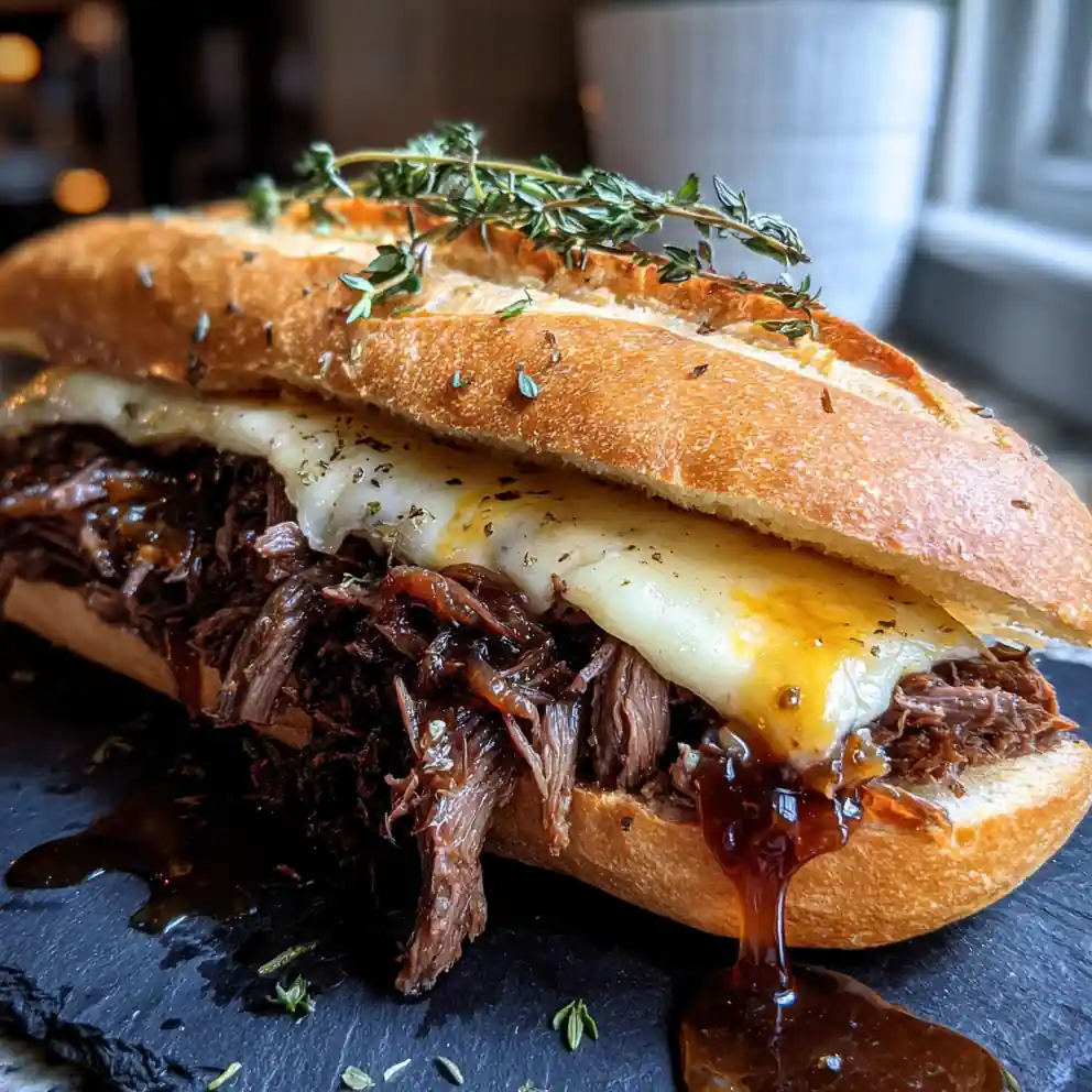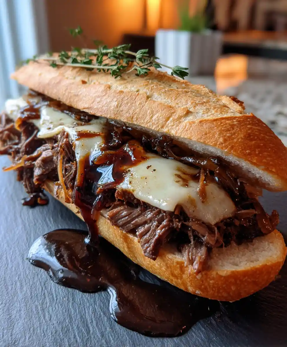 - Assemble and Serve: Layer the shredded beef onto the cheese-melted rolls. Drizzle generously with the warm miso-caramelized onion au jus. Top with the roll lid. Plate each sandwich on a dark slate board, drizzle a thin line of extra jus across the plate, and finish with a fresh thyme sprig placed against the sandwich for contrast and aroma.