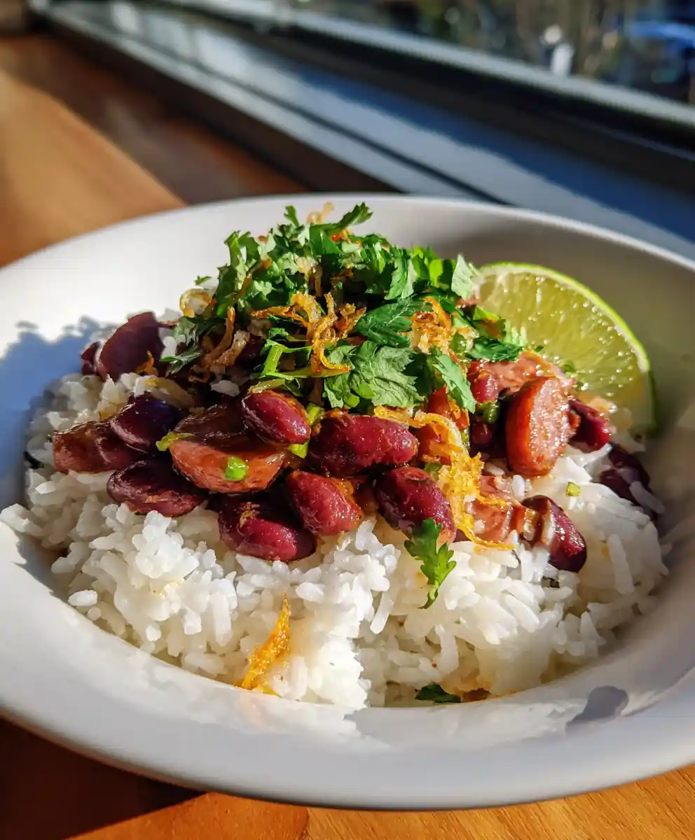 - Plate and Garnish: To serve, spoon a generous mound of fluffy rice onto a bowl. Ladle the red bean mixture over the rice. Drizzle the reserved chipotle-poblano coulis in a sweeping ribbon across the top. Sprinkle with fried shallots and chopped cilantro. Finish with a lime wedge on the side for a bright, acidic contrast.