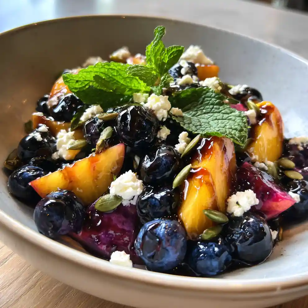 This Smoky Honey-Glazed Blueberry Peach Feta Salad is a vibrant mix of sweet, smoky, and savory flavors, perfect as a side dish or light lunch. It combines ripe peaches, juicy blueberries, salty feta, and crunchy pumpkin seeds in a luscious glaze.