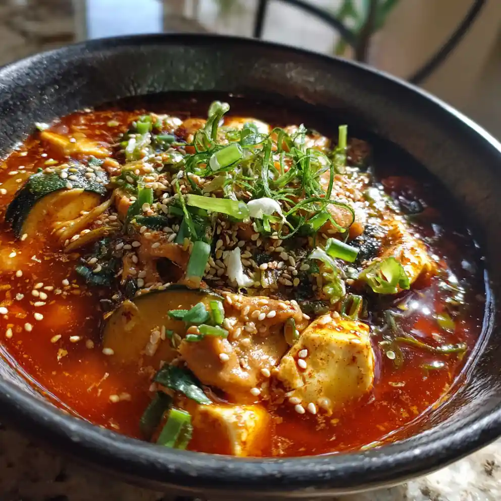 This quick and easy soft tofu soup features a rich, savory broth with a unique creamy peanut butter and gochujang swirl, delivering deep flavor and satisfying comfort in under 30 minutes. The silken tofu melts in your mouth for a perfect weeknight meal.