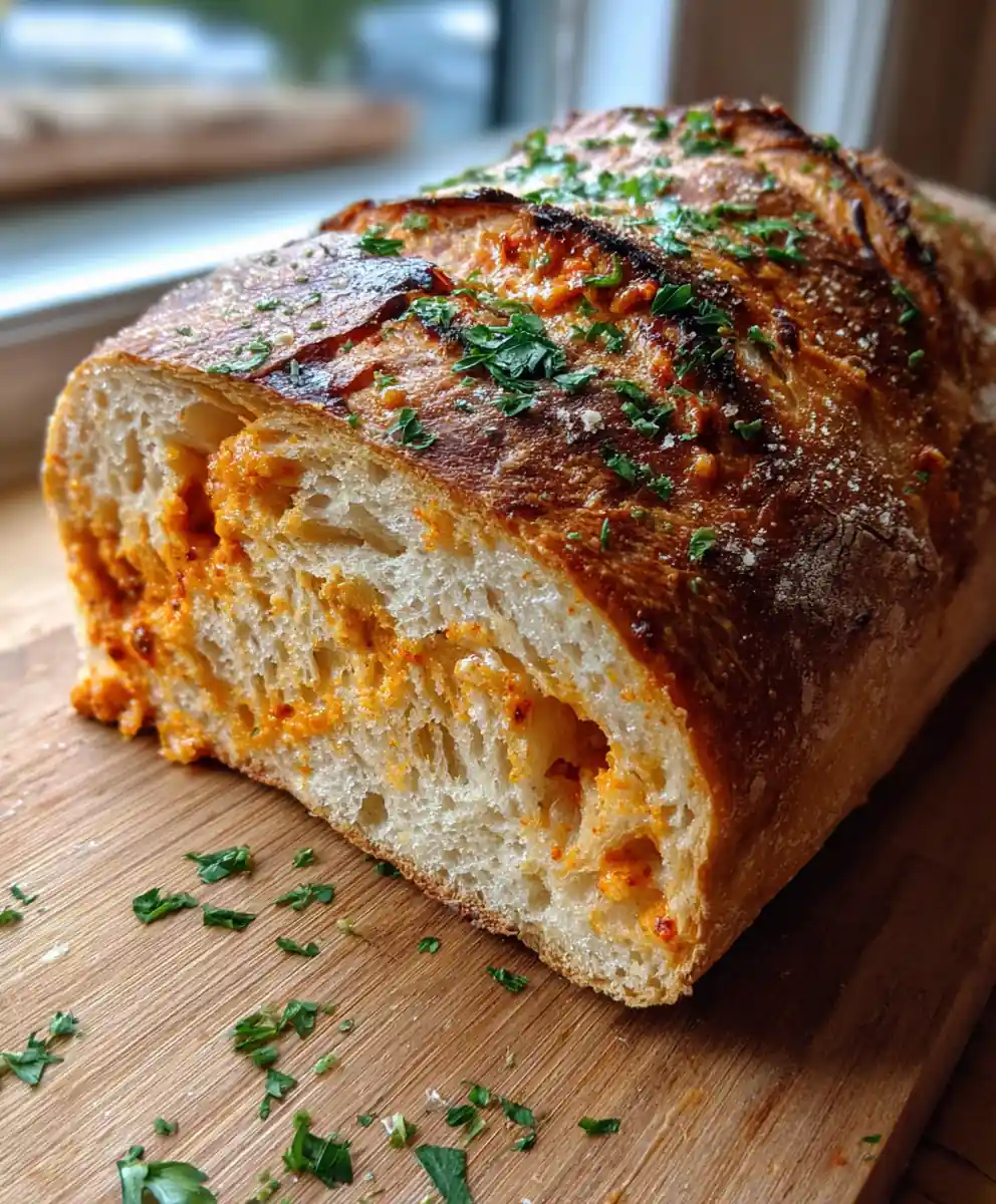 9. Serving: Slice the cooled sourdough loaf and garnish with reserved smoked paprika and fresh parsley for a vibrant presentation.
