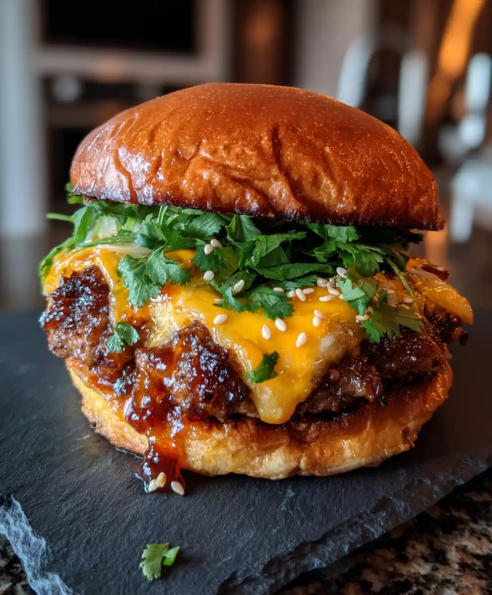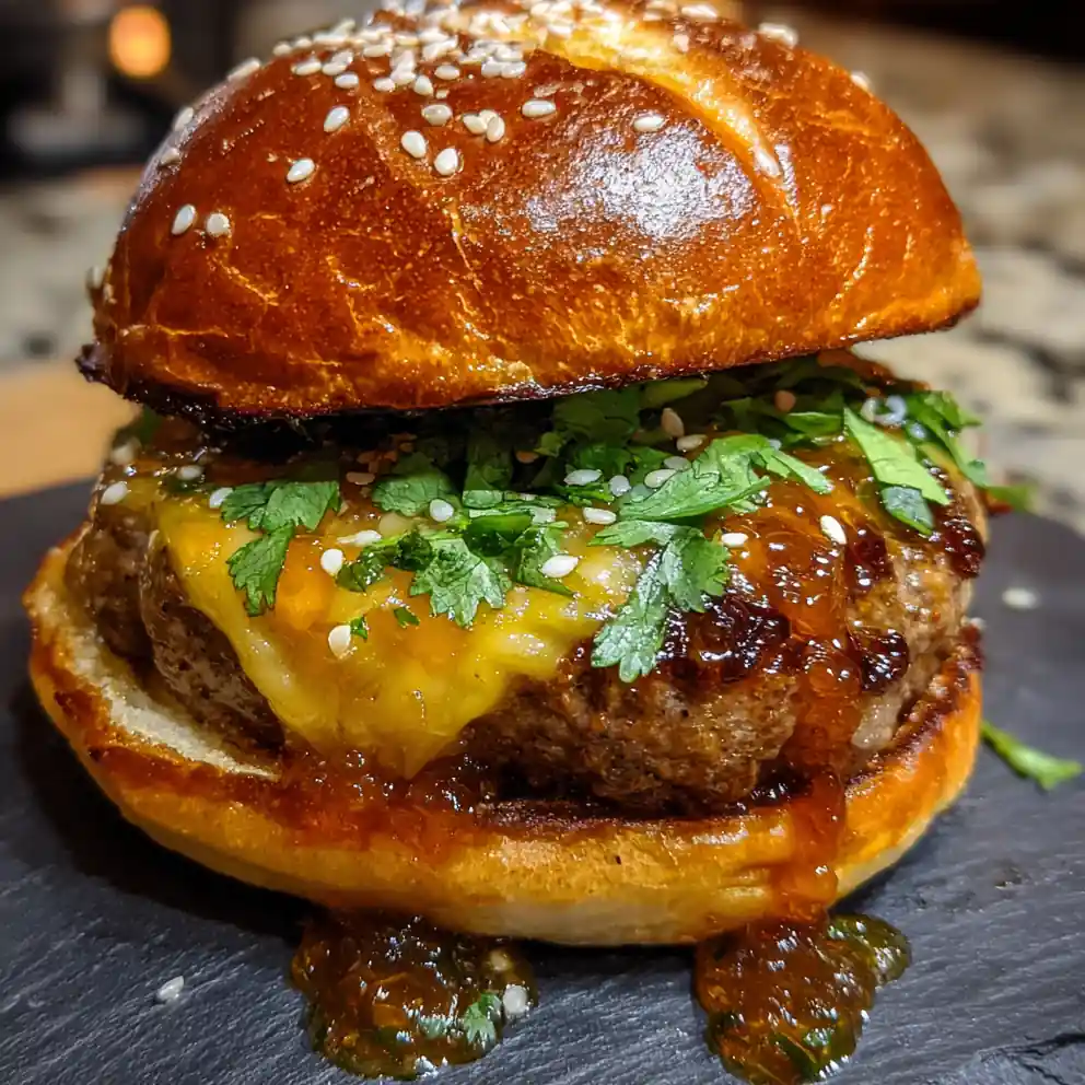 - Garnish and Serve: Finish with a few fresh cilantro leaves and a light sprinkle of toasted sesame seeds (optional). Cap with the top bun. Serve immediately.