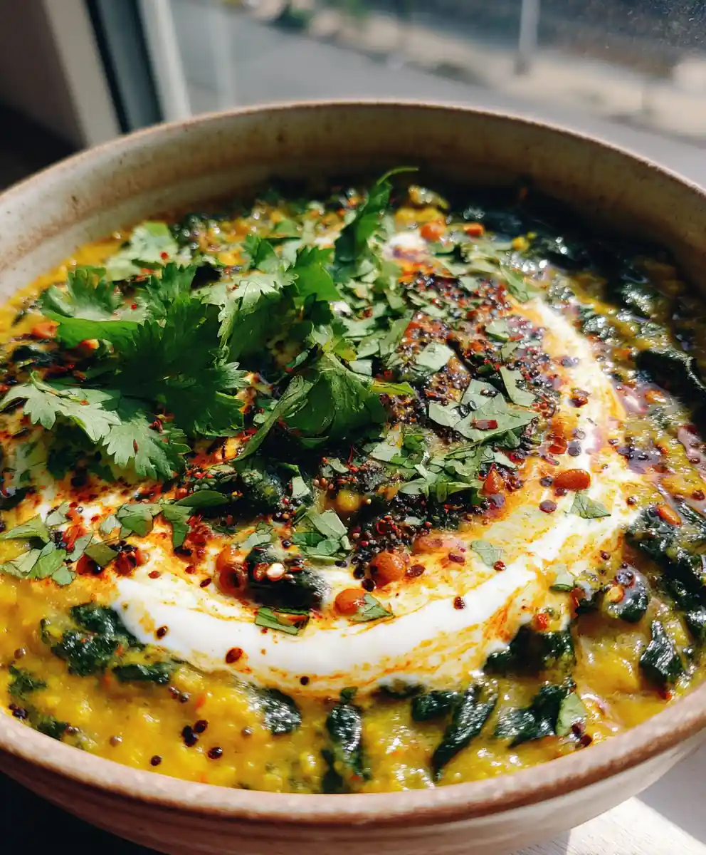 This creamy spinach dal recipe transforms humble red lentils and spinach into a flavorful, protein-packed dish. A coconut-curry leaf swirl added at the end provides a rich, aromatic finish to this vegetarian comfort food.