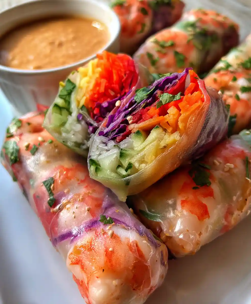 This recipe for Rainbow Veggie Spring Rolls offers a vibrant, crunchy, and fresh meal, perfect for a healthy and quick dinner idea. It features colorful vegetable ribbons and protein wrapped in translucent rice paper, served with a savory peanut dipping sauce.