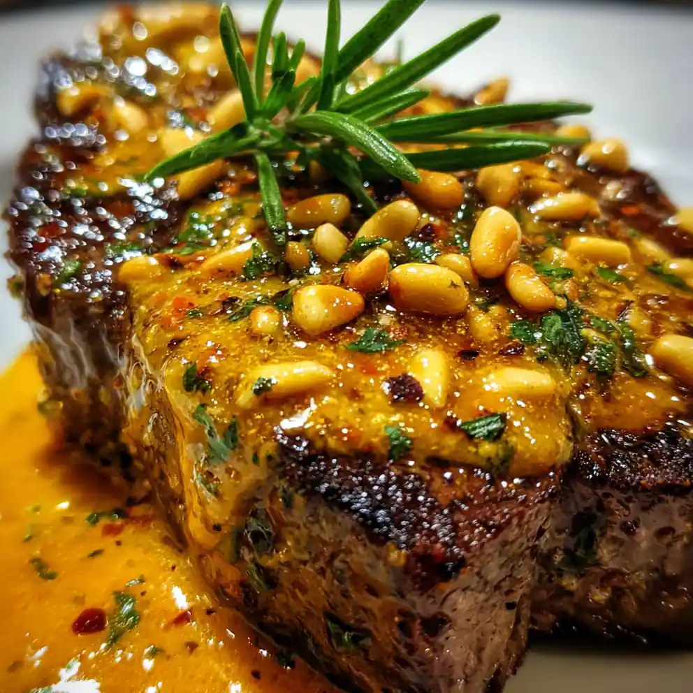 - Garnish For Plating: For an impressive presentation, place your dark, seared steak on a clean plate. Position the melting, vibrantly colored butter pat on top. Sprinkle the toasted pine nuts directly onto the melting butter and garnish with a fresh rosemary sprig.