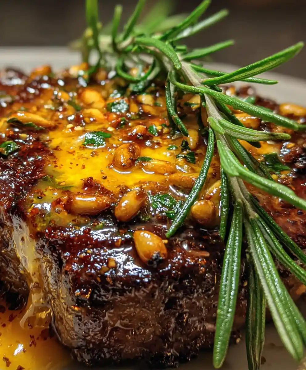 - Garnish for Plating: For an impressive presentation, place your dark, seared steak on a clean plate. Position the melting, vibrantly colored butter pat on top. Sprinkle the toasted pine nuts directly onto the melting butter for a delightful textural contrast and visual warmth. Garnish with a fresh, bright green rosemary sprig placed neatly alongside the steak to add a pop of contrasting color and botanical interest.