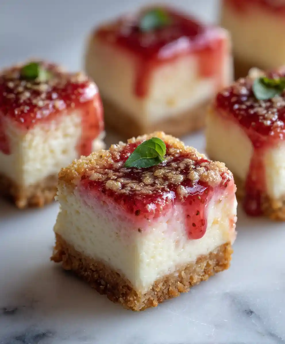 These no-bake Strawberry Cheesecake Crunch Bites with Basil Glaze offer a sophisticated and simple dessert experience. Combining creamy cheesecake, sweet strawberries, and fresh basil, these bite-sized treats are perfect for any occasion.