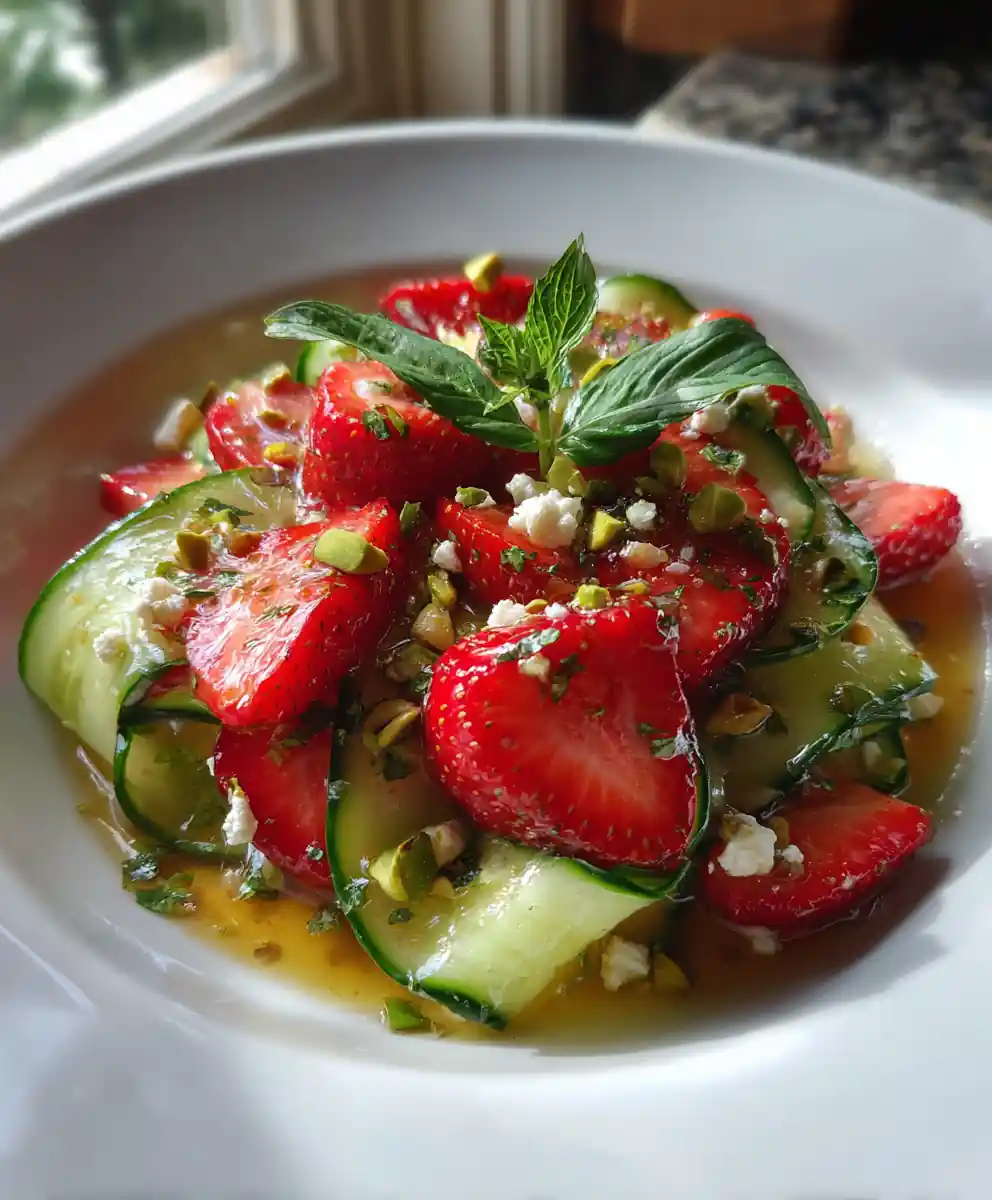 This Strawberry Cucumber Salad isn’t just a refreshing treat; it’s a carefully balanced combination of flavors and textures. The coolness of the cucumber provides a soothing base, while the sweetness of the strawberries offers a delightful contrast. The basil-honey lime dressing elevates the salad with its bright, herbaceous, and tangy notes. The slight acidity from the lime and apple cider vinegar cuts through the sweetness, preventing it from becoming cloying. The pistachios add a satisfying crunch and a subtle nutty flavor, while the optional feta introduces a creamy, salty element that complements the other ingredients beautifully. This salad is a prime example of how contrasting flavors can harmonize to create a truly memorable culinary experience.