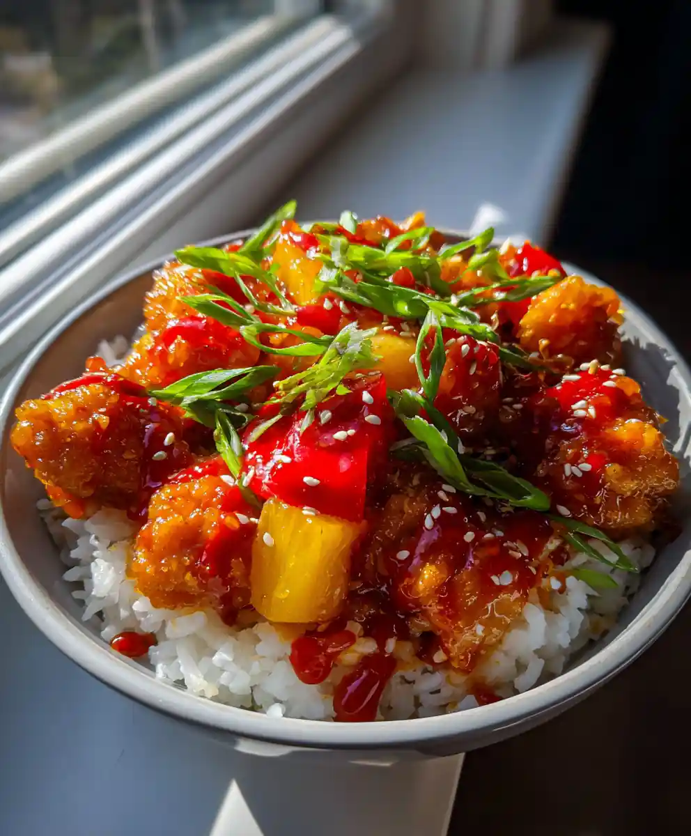 Serve the **sweet and sour chicken recipe easy** immediately over hot white rice in individual bowls to preserve the chicken’s crispiness. Create the distinctive visual by generously drizzling the spicy gochujang mixture over the chicken and rice. Finish with a sprinkle of toasted sesame seeds and fresh scallions for vibrant color and freshness. This **sweet and sour chicken recipe easy** presentation is perfect for family dinners and makes a delicious, healthy eating option.