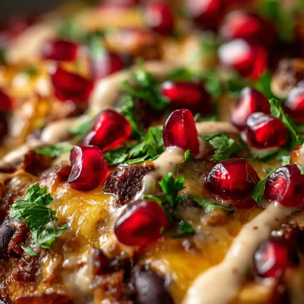 5. Prepare Drizzle and Garnish: While the skillet bakes, whisk together tahini, fresh lemon juice, cold water, grated garlic, and 0.25 tsp salt in a small bowl for the Sumac-Tahini Drizzle. Garnish the finished skillet with fresh pomegranate seeds and finely chopped fresh flat-leaf parsley.