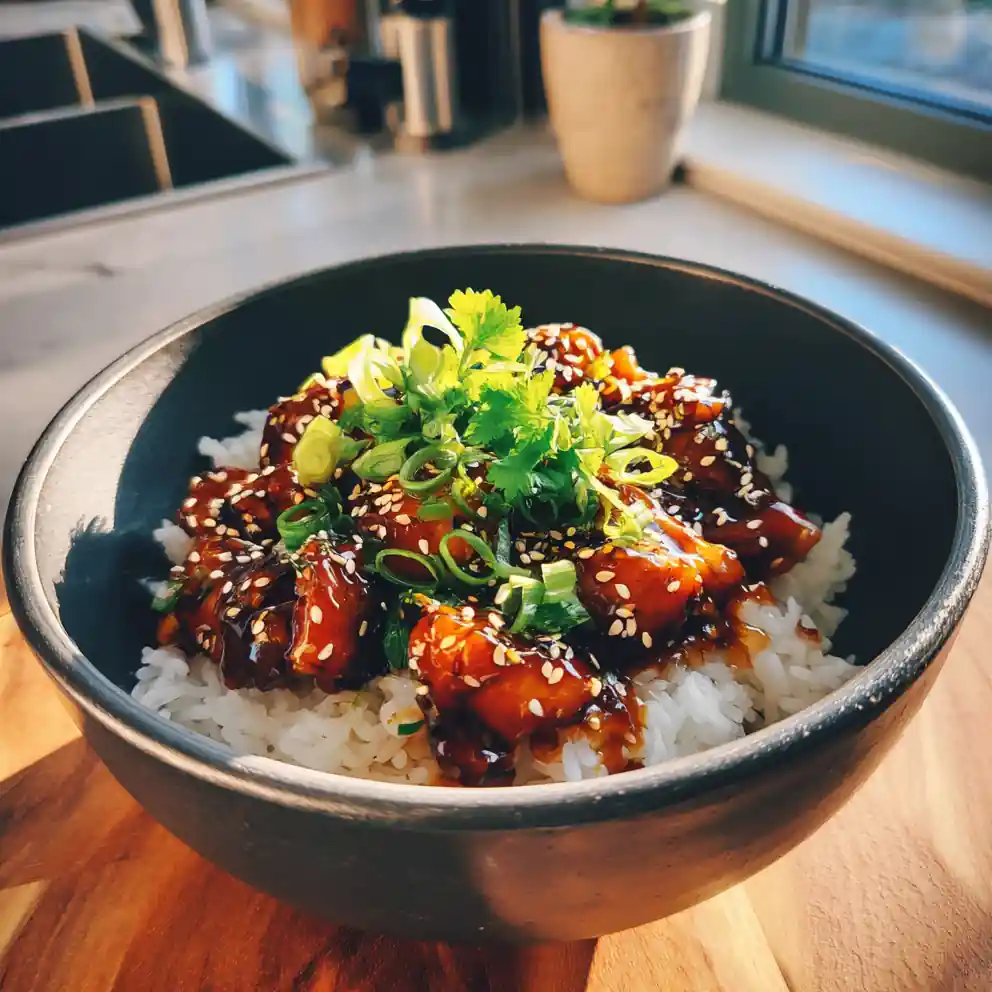 This Teriyaki Chicken Rice Bowl features tender chicken thighs glazed with a rich miso caramel sauce, served over jasmine rice and garnished with fresh herbs and sesame seeds. It’s a flavorful and satisfying meal ready in under 30 minutes.