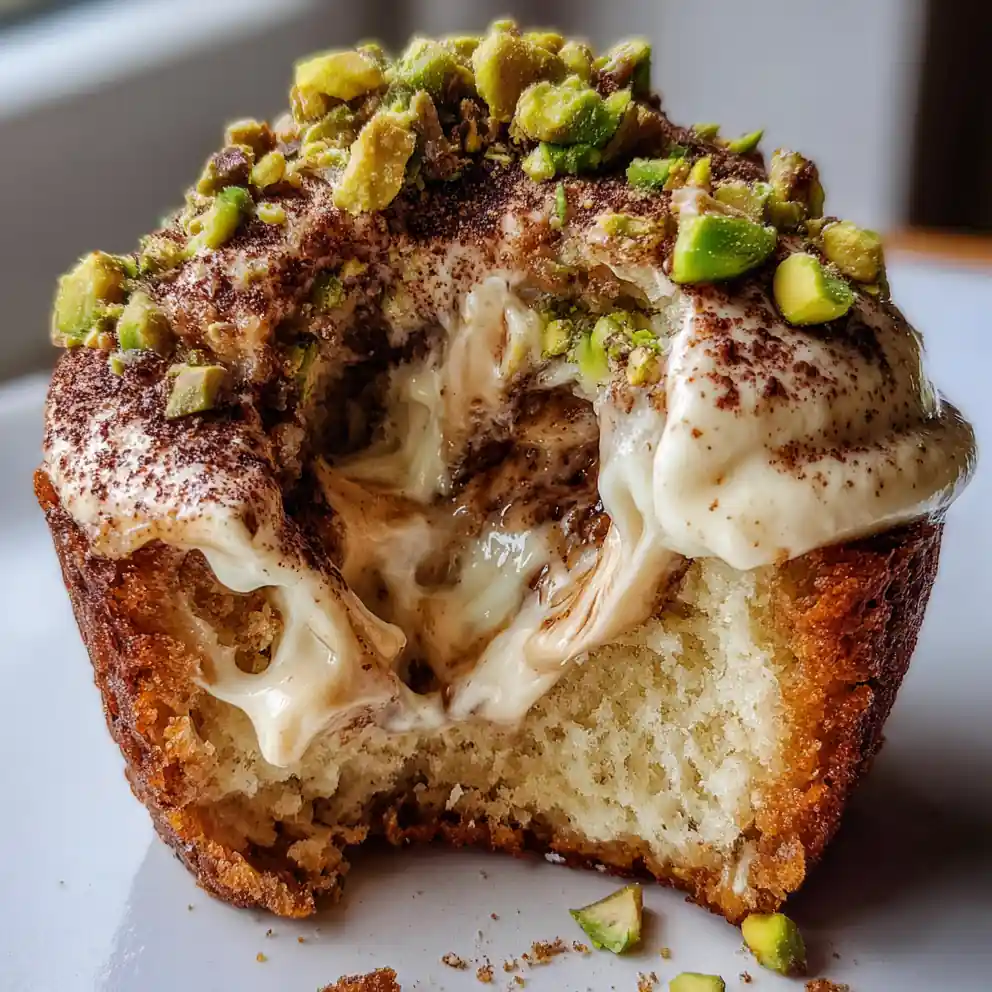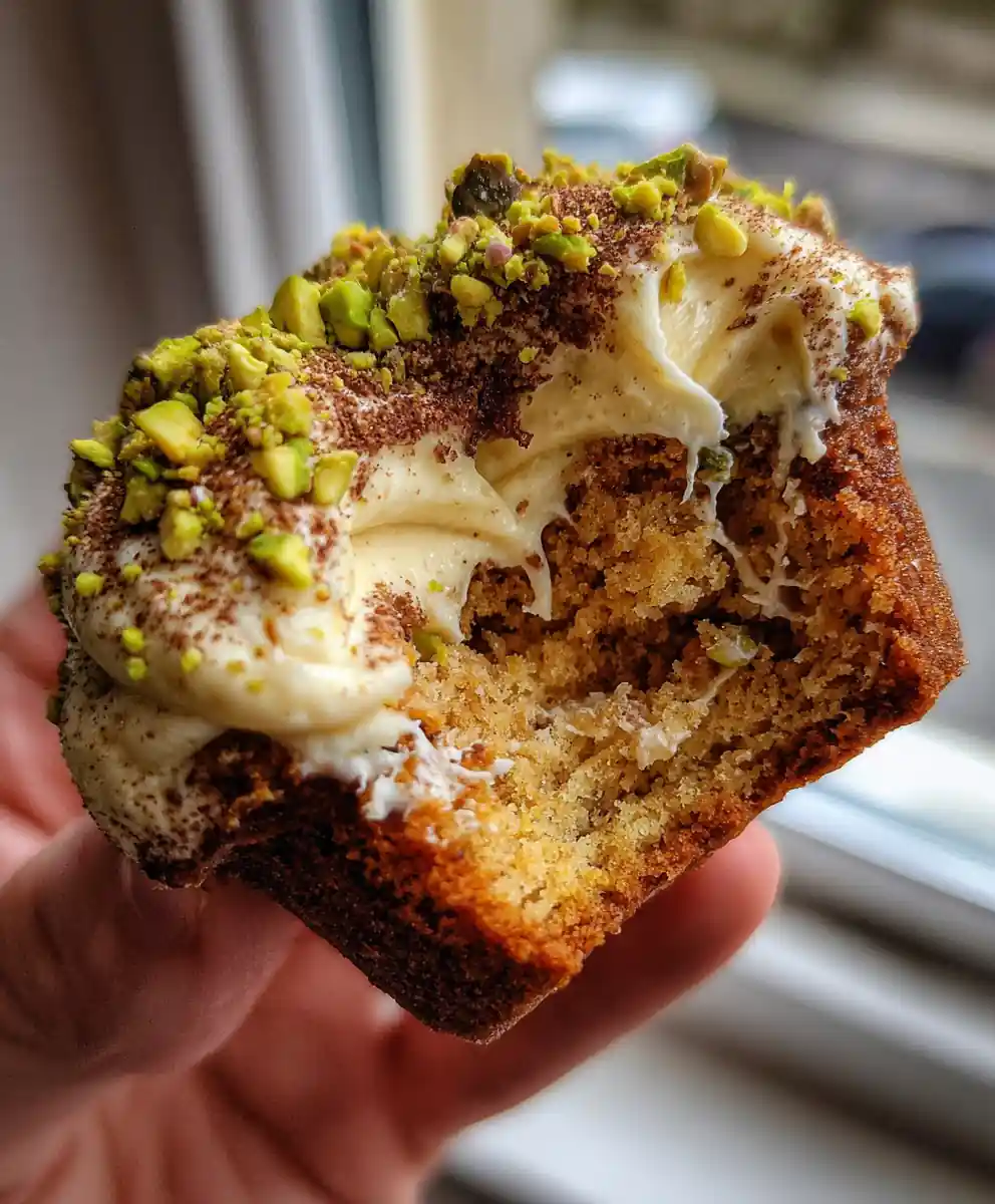 - Assemble Tiramisu Cupcakes: Once fully cooled, use a small knife to core out the center portion from each cupcake. Generously brush each cupcake top and core with the cooled espresso soak. Pipe or spread the mascarpone cream frosting generously over each cupcake. Immediately sprinkle with toasted pistachios and dust lightly with cocoa powder before serving.