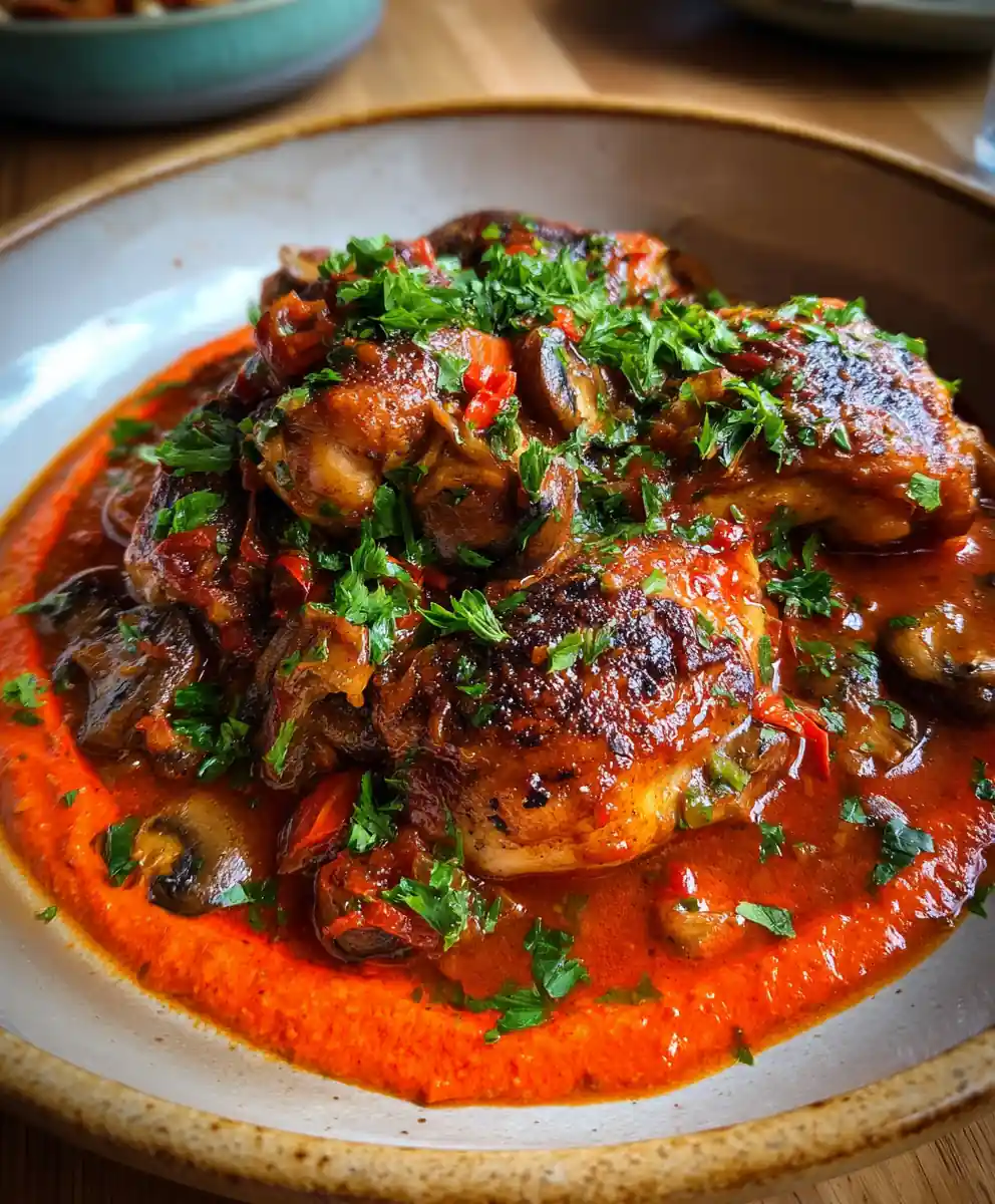 4. Simmer to Perfection: Return the seared chicken pieces to the pot, nestling them into the sauce so they are mostly submerged. Reduce heat to low, cover the pot, and simmer for 45-60 minutes, or until chicken is very tender and cooked through. During this time, preheat oven to 200ยฐC (400ยฐF) for the swirl; halve and deseed two red bell peppers, then roast cut-side down on a baking sheet for 25-30 minutes until charred and tender. Prepare the Smoky Red Pepper Swirl by blending roasted peppers, 1 clove garlic, 5 ml (1 tsp) smoked paprika, 30 ml (2 tbsp) olive oil, 30 ml (2 tbsp) vegetable broth, 2.5 ml (0.5 tsp) sea salt, and a pinch of sugar until smooth. Taste the cacciatore and adjust seasoning if needed before serving with the vibrant swirl and fresh parsley.