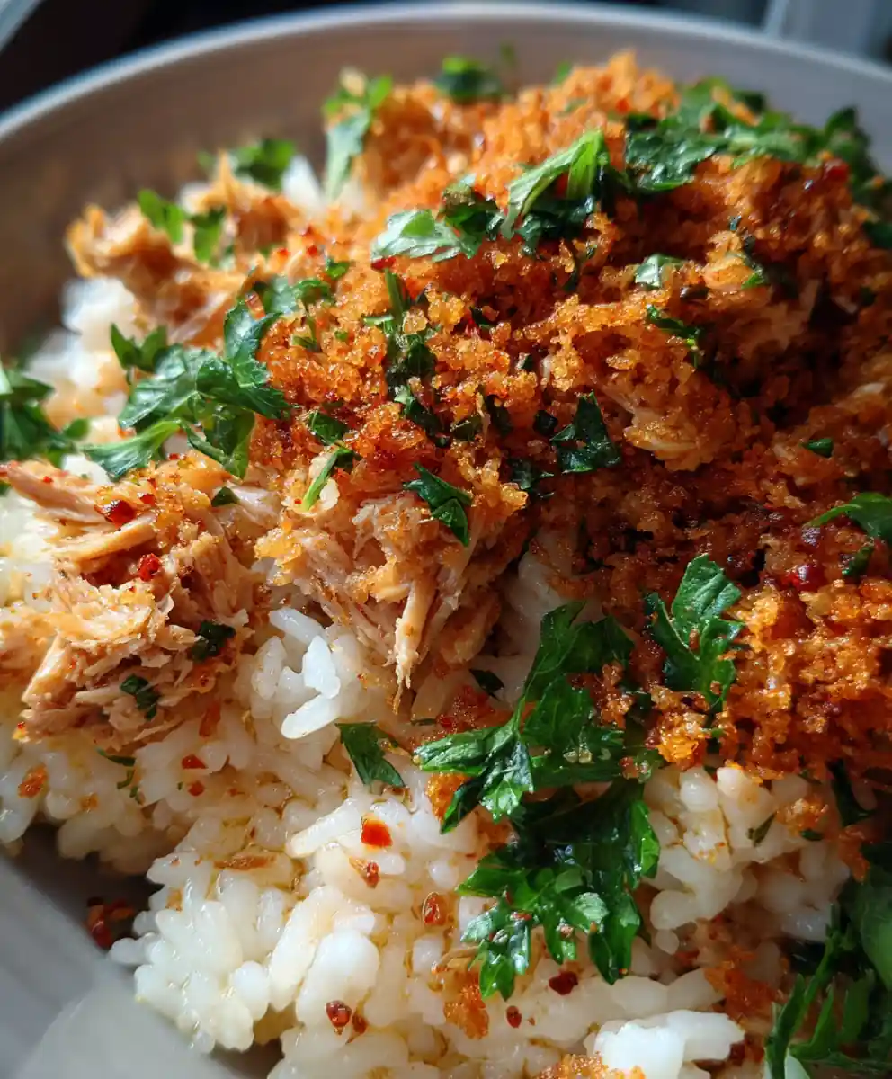 - Serve and Garnish: Scoop a generous portion of the seasoned tuna and rice mixture into a wide, shallow bowl. Sprinkle a generous amount of the prepared Crispy Herb Crumble evenly over the top. Finish with a light drizzle of extra virgin olive oil over the crumble and scatter a few small fresh parsley leaves for a final color pop.