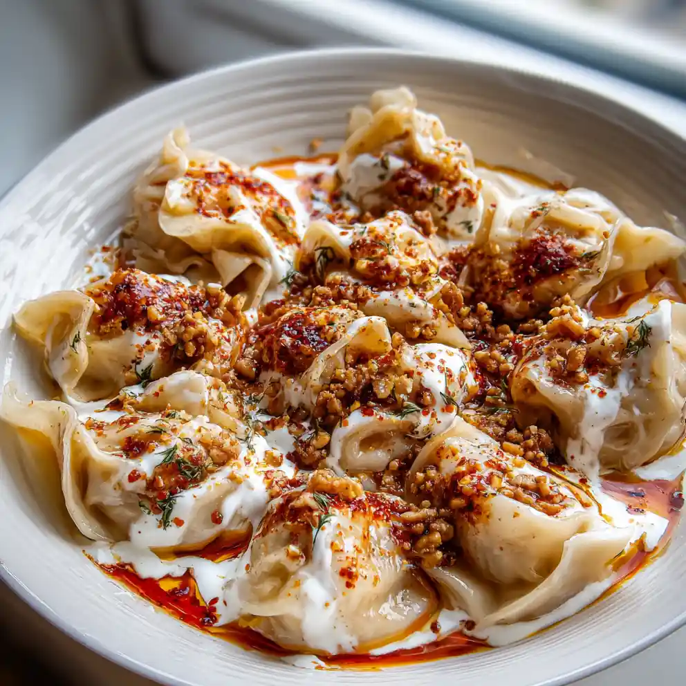 - Assemble and Serve: Arrange the hot, cooked manti evenly in wide, shallow bowls. Spoon a generous dollop of the cool garlic yogurt over the manti. Generously drizzle the glossy, reddish-orange Smoky Red Pepper & Walnut Butter Drizzle over the yogurt, allowing it to pool and drip enticingly. Garnish with a sprinkle of dried mint and a few extra finely chopped walnuts for delightful texture and visual interest.