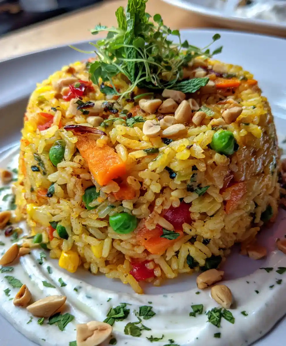 9. Plating & Garnishing: Spoon the herbed vegetable rice onto a warm plate, using a rounded mold for an elegant presentation. Drizzle a thin line of extra virgin olive oil around the rim of the plate for a glossy finish.