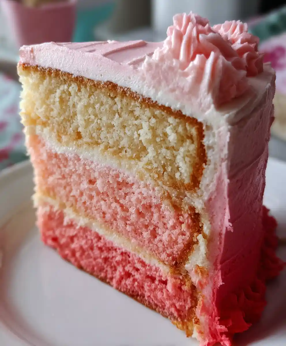 10. Assemble & Decorate: Level the cooled cake layers if needed using a serrated knife. Frost the first cake layer with the lightest pink buttercream. Place the second layer on top, and frost with the medium pink. Then, use the darkest pink for the top and sides, blending gently for a beautiful strawberry ombre effect. The finished vanilla cake recipe with strawberry ombre buttercream will look stunning.