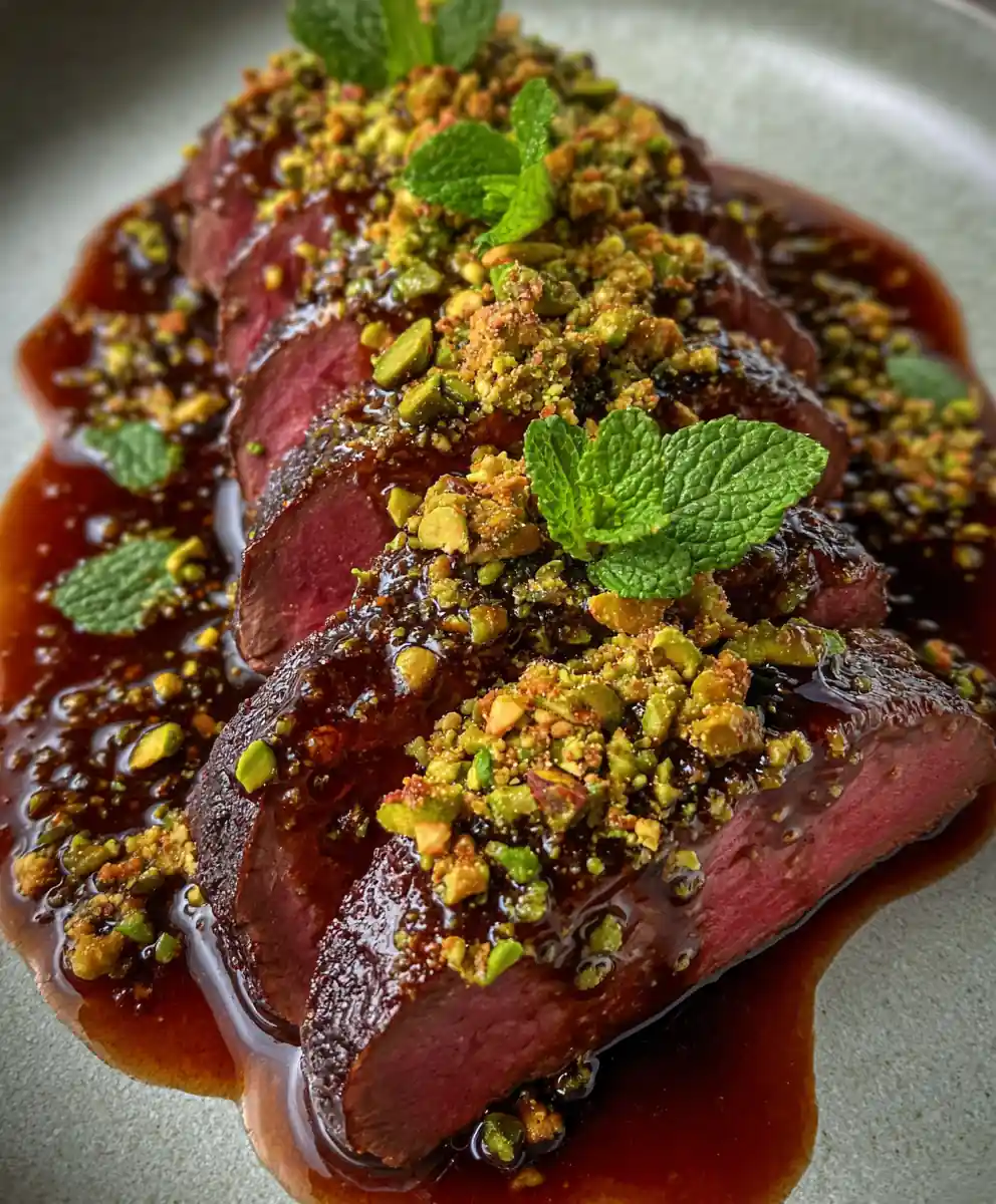 7. Slice & Plate: Slice the rested venison steaks against the grain into 0.4 to 0.6 inch thick slices. Arrange on a warm plate. Drizzle with the warm Sumac-Date Glaze, then sprinkle with chopped pistachios and fresh mint leaves.