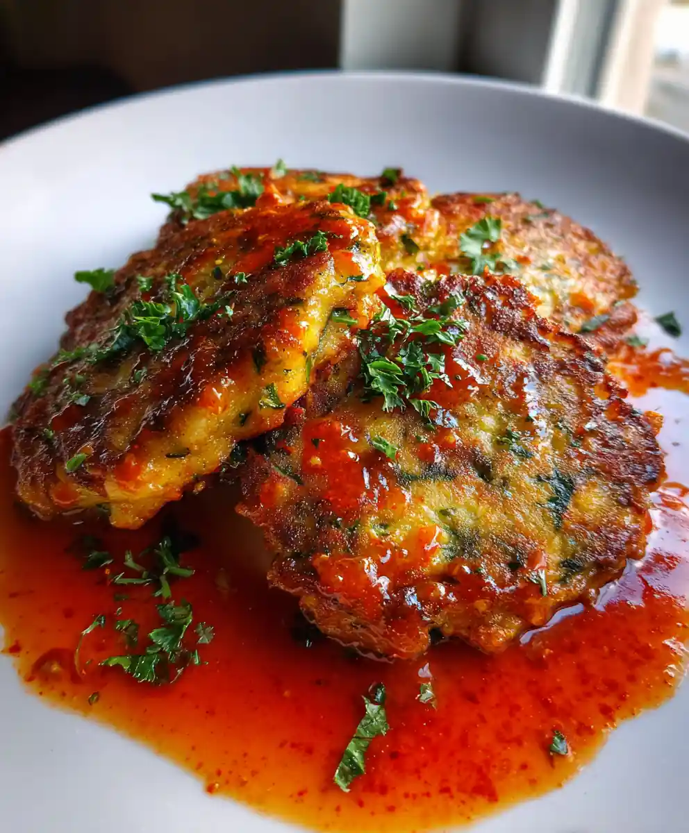 5. Serve: Transfer cooked cakes to a paper towel-lined plate to absorb excess oil. Serve warm with the red pepper drizzle and garnish with fresh parsley.